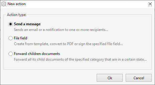 Selecting "Send a message" will open the automatic email editor to create a new email or notification to be send when you forward along this transition. You can see more details on the creation of automatic emails here. The only difference here is that you save by pressing "OK"
