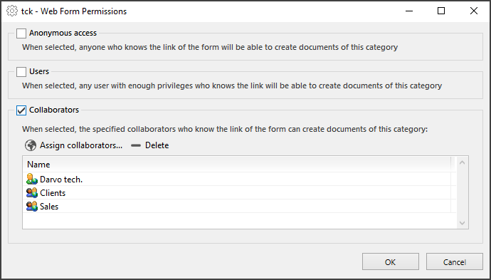 If the option "Collaborators" is selected, it is necessary to define which collaborators can create forms by clicking the "Assign collaborators" button.